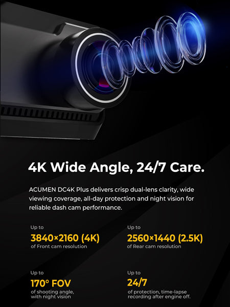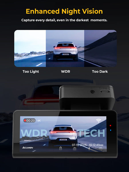 The Acumen DC4K Plus delivers unmatched clarity and reliability on every journey. Featuring 4K front and 2.5K rear dual-channel recording, it captures every road detail with true-to-life precision, ensuring clear license plate recognition even in fast-moving scenarios. Advanced WDR technology balances light and shadow for crisp images in all lighting conditions—from harsh sunlight to dim tunnels—while built-in Wi-Fi and GPS let you view, download, and track routes seamlessly via the mobile app.