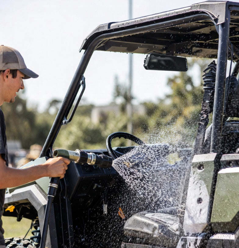 Rinse the cabinWater spray is common on UTVs because there's no glass barrier.